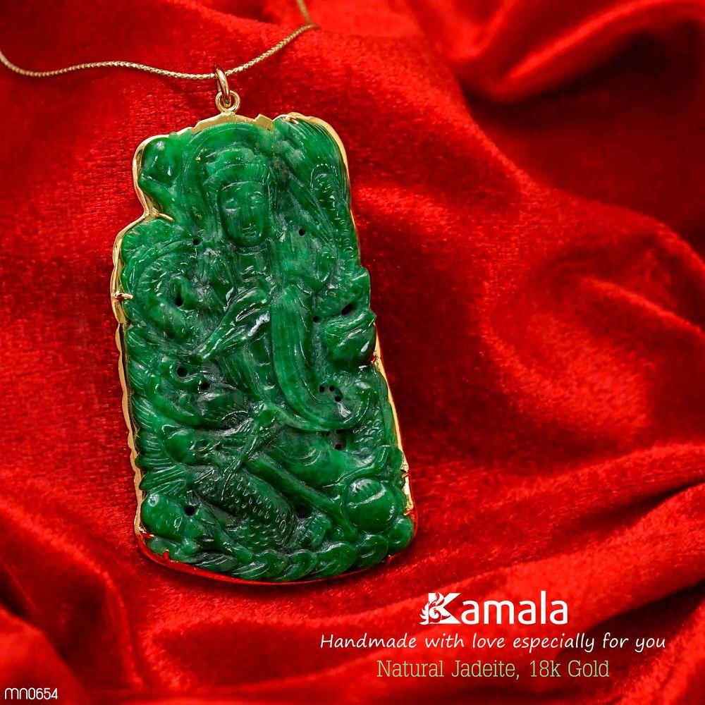 Mề đay Ngọc cẩm thạch Quan Âm bản to, nặng 86 carat, kích thước 62x39 li, chạm khắc tinh tế với hình tượng Rồng và đức Quan âm cứu độ, chế tác vàng 18k tinh tế.