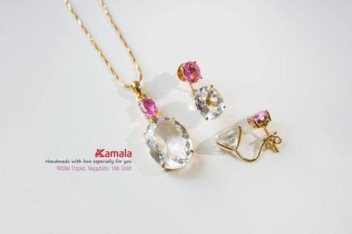 Mề đay Topaz trắng 15 carat (20x15 li) đính Sapphire hồng Sri Lanka 1.4 carat (7x5.5 li), vàng 18k. Hoa tai Topaz trắng 8.6 carat (12x10 li) đính Sapphire hồng Sri Lanka 2.8 carat (7.5x5.5 li), vàng 18k.