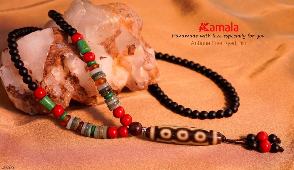 Viên ngọc Dzi 5 mắt, kích thước (50x12mm), phối lưu ly (6-8li), ngọc Myanmar tròn dẹp (8li), Turquoise (6-10x6li), tử đàn (10li), bạc 925