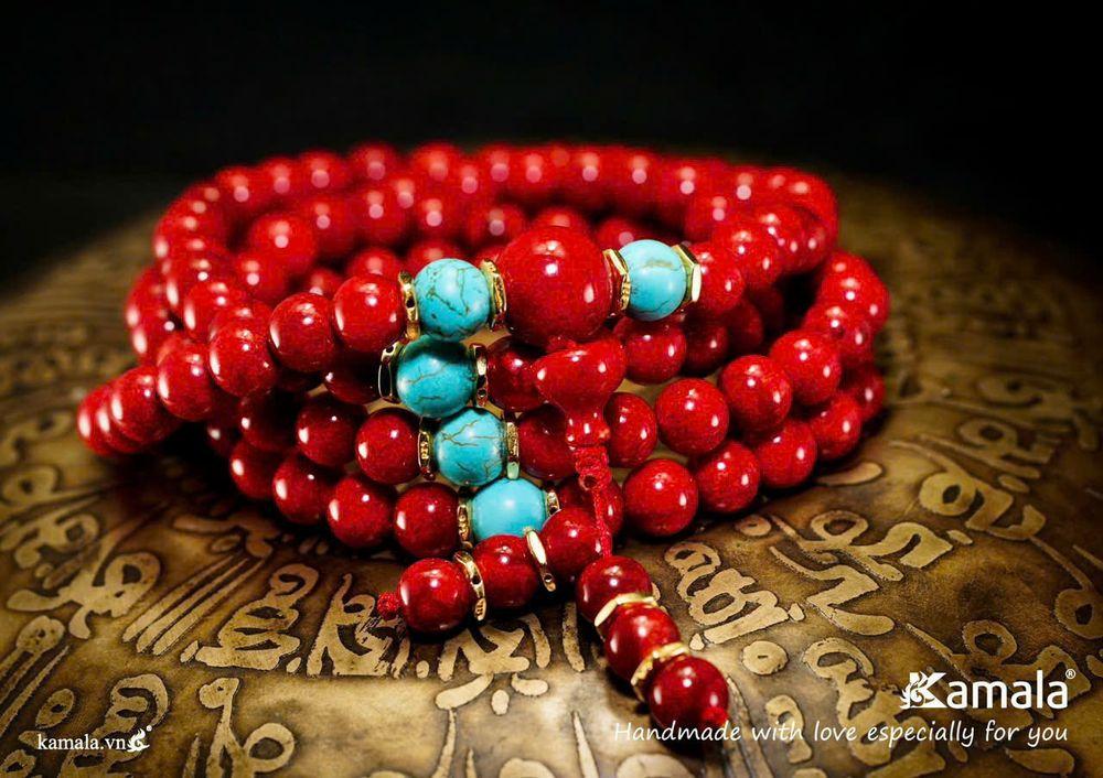 Chuỗi mala san hô phối đá turquoise 108 viên san hô 8li, 5 viên turquoise 8li đệm bạc phủ vàng cao cấp