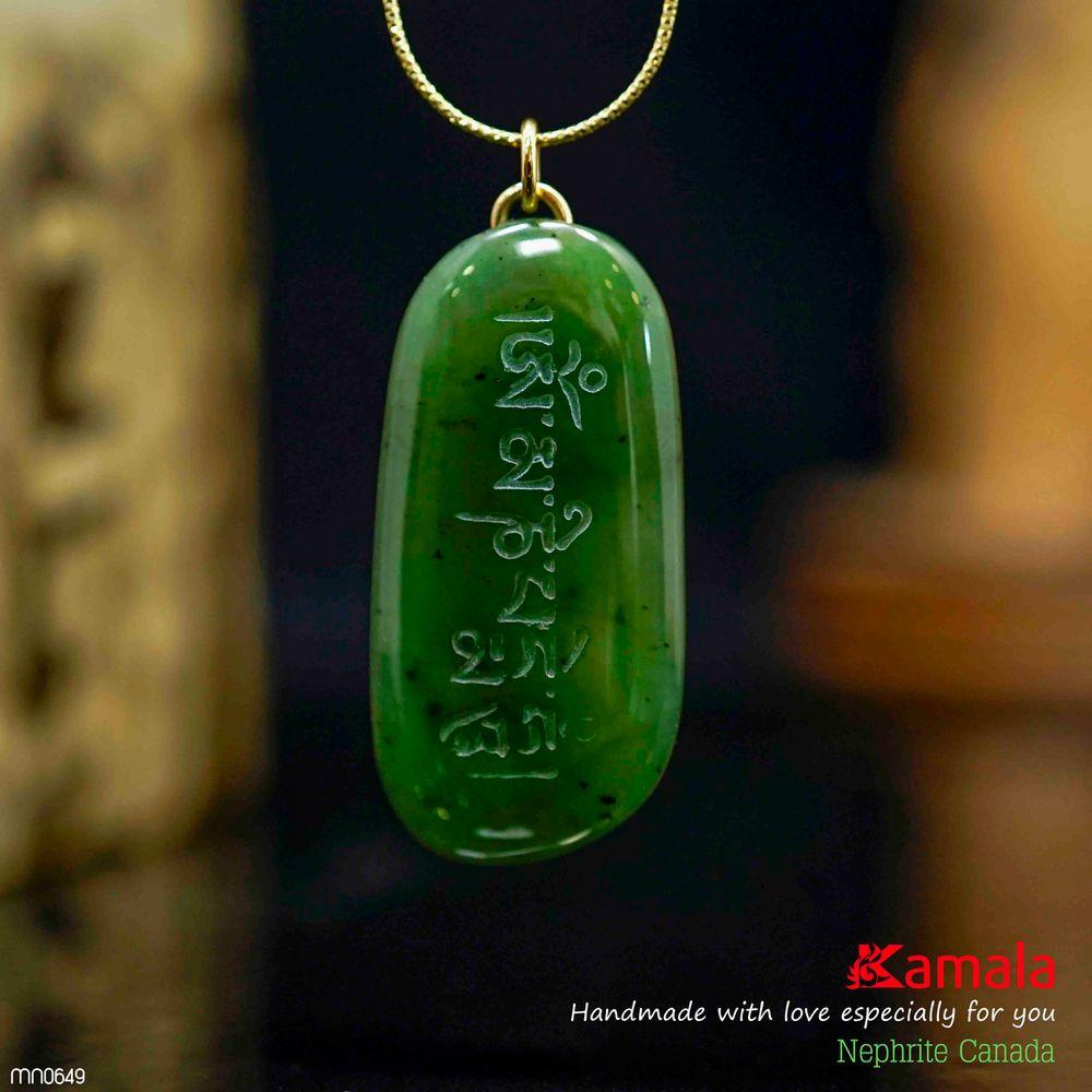 Mề đay Ngọc bích Nephrite Canada chạm khắc Chú Quán Thế Âm, kích thước (42x20,5 li), chế tác vàng 14k.