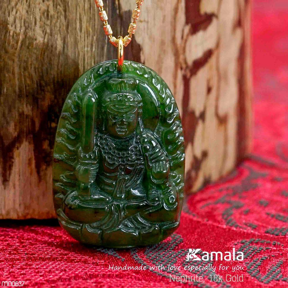Mề đay Ngọc bích - Nephrite mang hình Đức Bất Động Minh Vương Bồ tát, kích thước (28,5x38 li), vàng 18k.