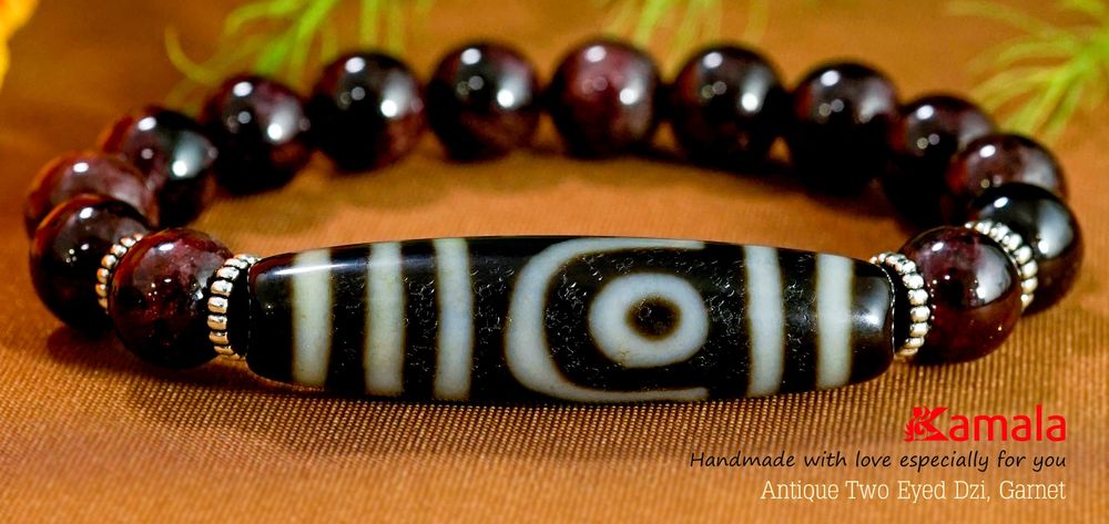 Dzi 2 mắt, kích thược (41,5x11li), 14 viên Garnet (8li), 4 đệm hoa bạc cao cấp