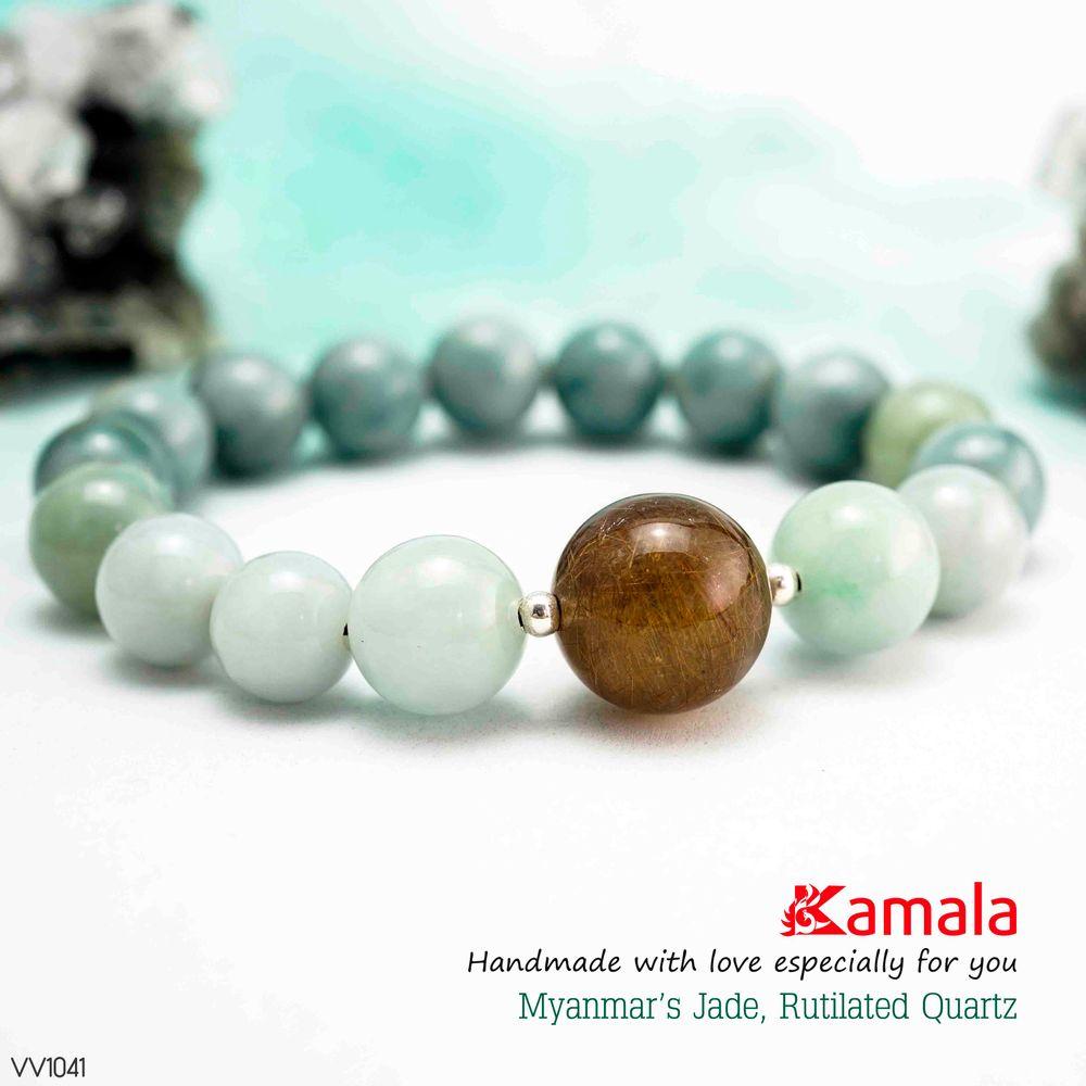 Vòng tay Ngọc Myanamr (11 li) phối Thạch anh tóc nâu (14,5 li) cùng đệm bạc cao cấp.