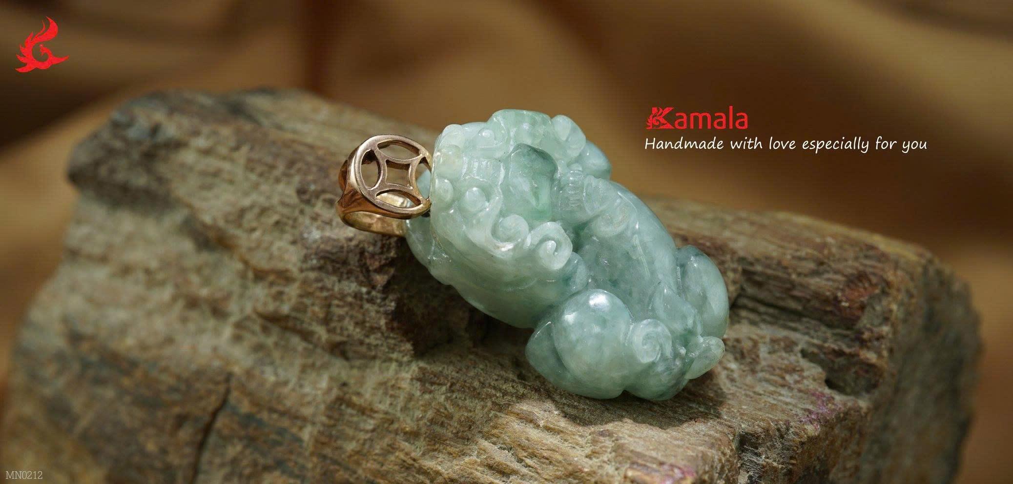 Mề đay Ngọc cẩm thạch Quan Âm bản to, nặng 86 carat, kích thước 62x39 li, chạm khắc tinh tế với hình tượng Rồng và đức Quan âm cứu độ, chế tác vàng 18k tinh tế.